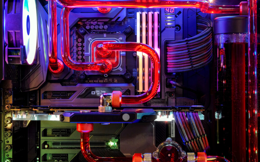 Desktop PC Gaming and water cooling cpu with LED RGB light show status on working mode